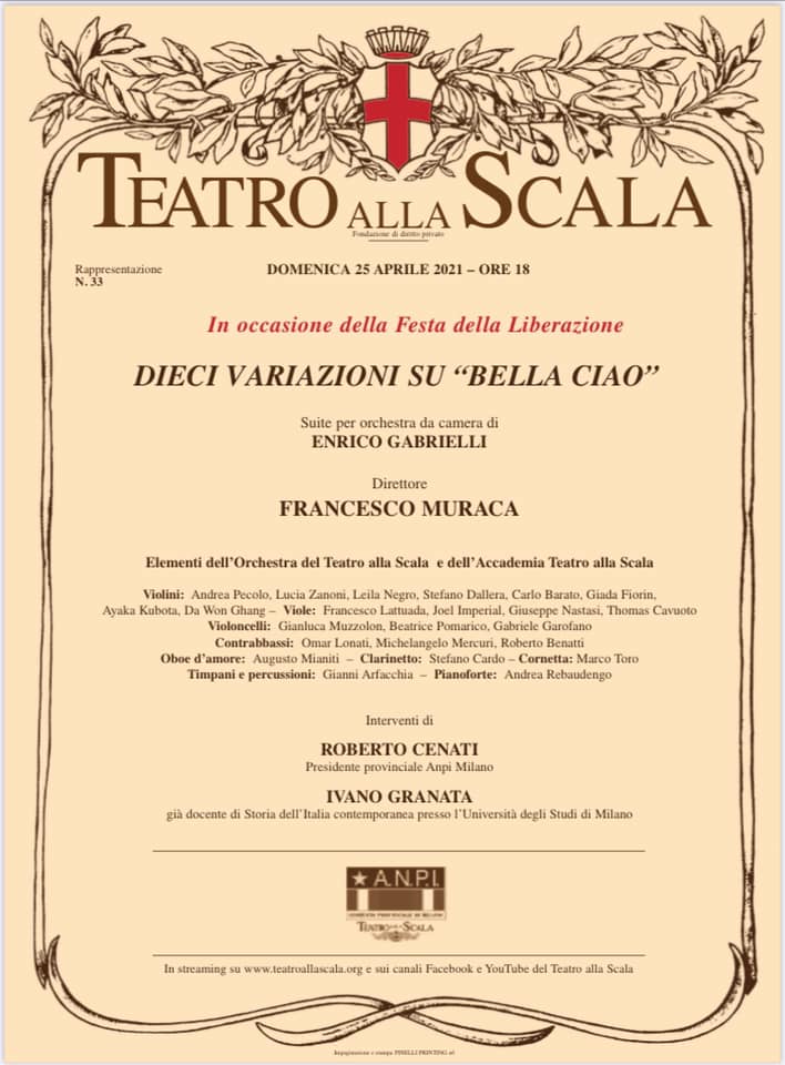 “Il 25 Aprile, giorno della liberazione di Milano, sui social network del teatro alla Scala risuoneranno ‘dieci variazioni su Bella ciao’.