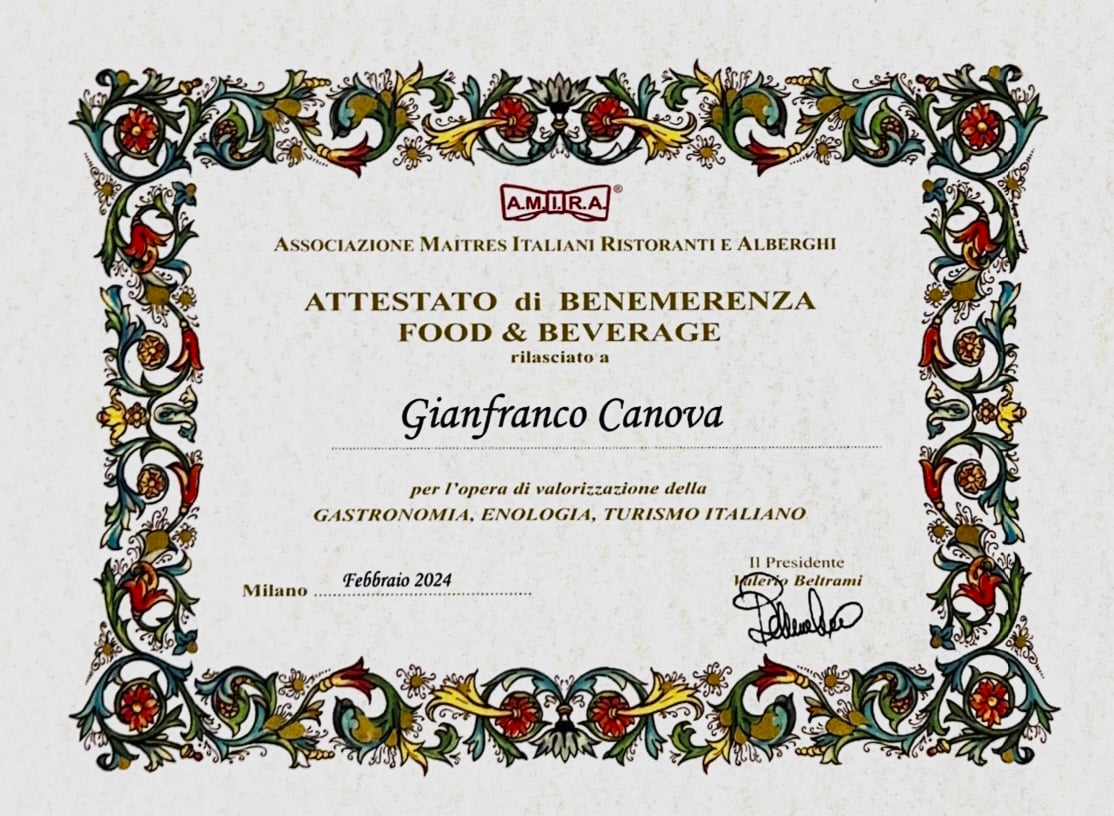 Il fiduciario ha voluto sottolineare la stima nei confronti di Gianfranco Canova per la grande professionalità che esprime quotidianamente nel settore dell’”accoglienza”. Gianfranco offre un servizio d’eccellenza per tutto ciò che concerne il servizio di sala alla carte ed alla banchettistica.