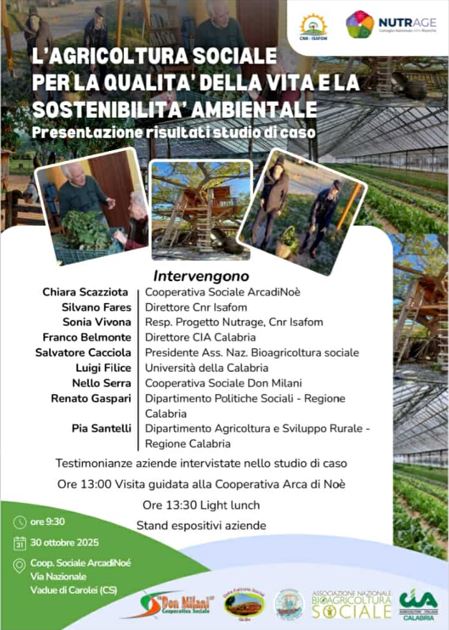 L’Agricoltura che cura. Presentazione risultati dello studio di caso CNR ISAFOM su “L’agricoltura sociale per la qualità della vita e la sostenibilità ambientale”, il 30 Ottobre 2025 a Vadue (CS) presso la Cooperativa ArcadiNoè