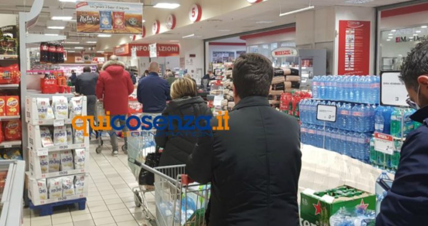 “All’indomani delle disposizioni dettate dal premier Giuseppe Conte, a Cosenza e nell’area urbana iniziano a registrarsi le prime code davanti ai supermercati per gli approvvigionamenti. Rispettate le regole della distanza ma da Palazzo Chigi sottolineano: “no affollamenti e spesa, non c’è bisogno””