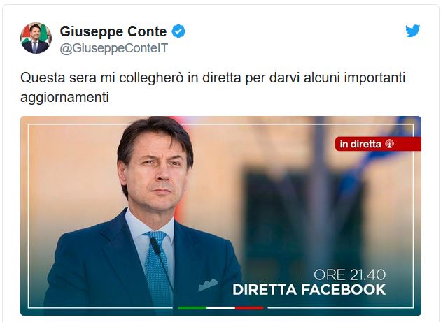 “Ha riunito a Palazzo Chigi i capi delle delegazioni dei partiti di governo e si prepara a nuovi importanti annunci, Giuseppe Conte. Il premier scrive su Twitter: “Questa sera mi collegherò in diretta per darvi alcuni importanti aggiornamenti”.”