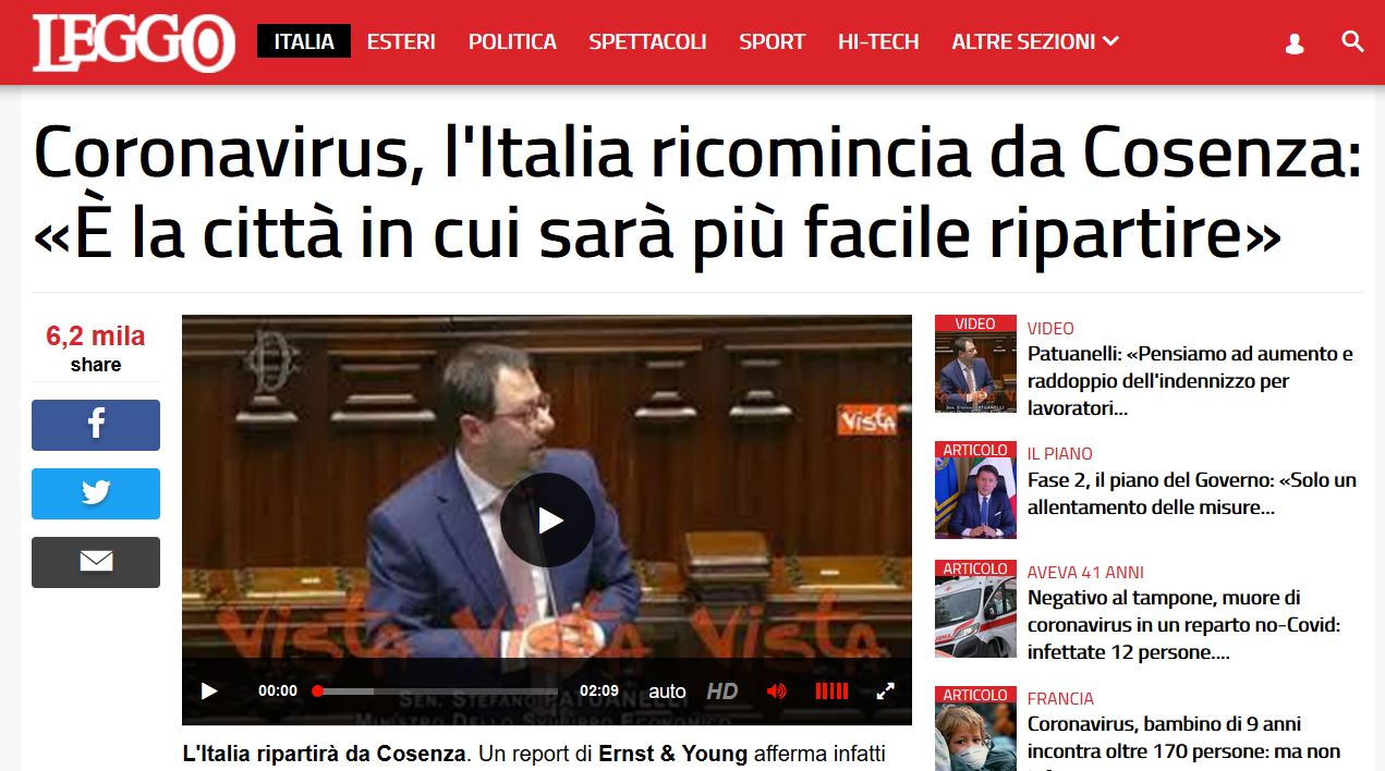 “Il report, scritto dal network mondiale di servizi professionali di consulenza e formazione che ha condotto uno studio per verificare la situazione delle città italiane alle prese con la cosiddetta Fase 2, è stato riportato da una nota proprio del Comune di Cosenza. «Ernst & Young ha incrociato gli indicatori di resilienza (fattori sanitari, economici e sociali) con i dati del contagio Covid-19», si legge nella nota.”