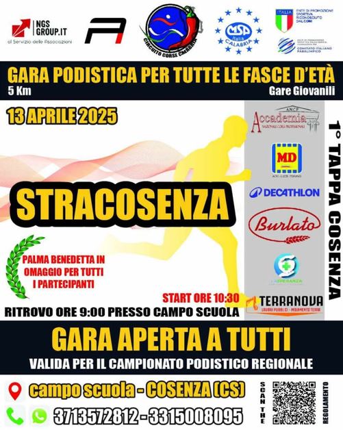 La manifestazione podistica StraCosenza è organizzata dal MSP Italia – Comitato Provinciale di Cosenza ed è inclusa nel Circuito Corse Calabria. L’evento si svolgerà a Cosenza (CS) domenica 13 aprile 2025. Il ritrovo è fissato dalle ore 8:00 presso il Campo Scuola di Cosenza, via degli Stadi con partenza per le ore 10:30.