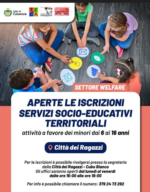 I servizi verranno erogati dall’Associazione Teca e con il partenariato della Cooperativa delle Donne e Cooperativa Don Bosco. Il progetto coinvolgerà complessivamente 100 minori dai 6 ai 16 anni, residenti nel Comune di Cosenza e sarà completamente gratuito.