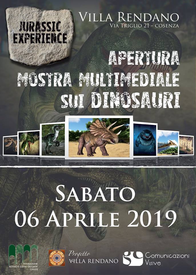 Jurassic experience, nella storica Villa Rendano, ci trasporta in un mondo scomparso, in un mondo di oltre 65 milioni di anni fa. Il percorso, frutto di ricerche scientifiche, realizzato in 3D con effetti speciali, ci permette di passeggiare nei suggestivi scenari dell’era paleozoica, mesozoica, fino al cretaceo ci mostra l’evoluzione della vita sulla terra. Incontreremo numerosi dinosauri di cui scopriremo le caratteristiche fisiche, alimentari, i luoghi e i periodi in cui hanno vissuto. Un percorso didattico che ci regala un vero e proprio viaggio virtuale costellato da stupefacenti colpi di scena!