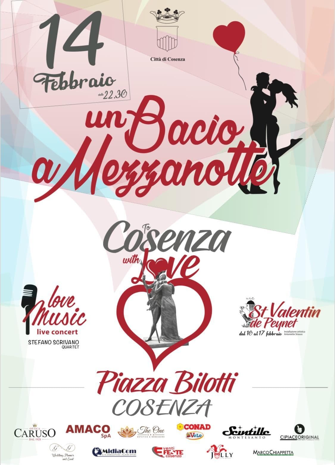 “Un bacio a Mezzanotte” vuole essere la dimostrazione del “come” e del “perché” si parli sempre d’amore, di coppie, di amori appena sbocciati o di cuori infranti, dopotutto la parola “amore” abbraccia tutti i rami del nostro vivere quotidiano; a far risuonare Cupido sarà Piazza Bilotti a Cosenza, dove si svolgerà l’evento “Un bacio a Mezzanotte” durante la serata del 14 Febbraio (Giorno di San Valentino) dalle ore 22.30, e per l’occasione debutterà il Gruppo Stefano Scrivano Quartet, e prima della mezzanotte si darà inizio ad un count-down, momento saliente per le coppie che dovranno darsi un bacio, esprimere un desiderio e lanciare un palloncino in aria, il tutto allo scoccare della mezzanotte; inoltre sarà possibile visitare l’installazione artistica di Antoniette Strauss dal 10 al 17 Febbraio.