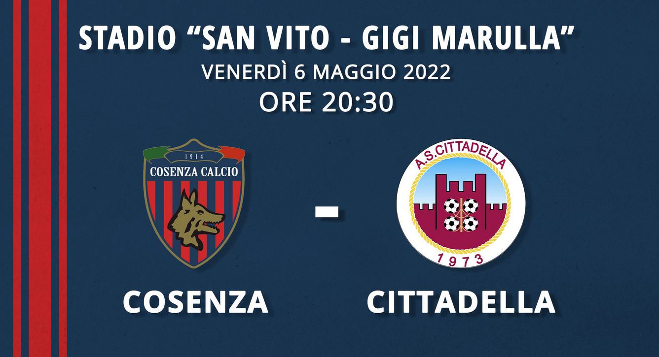 La Società Cosenza Calcio comunica che è attiva dalle ore 16:00 di ieri, lunedì 2 maggio 2022, la prevendita per la gara Cosenza – Cittadella, valida per la 38° giornata del Campionato Serie BKT 2021/2022, in programma allo Stadio “San Vito – “Gigi Marulla” alle ore 20:30 di venerdì 6 maggio 2022.