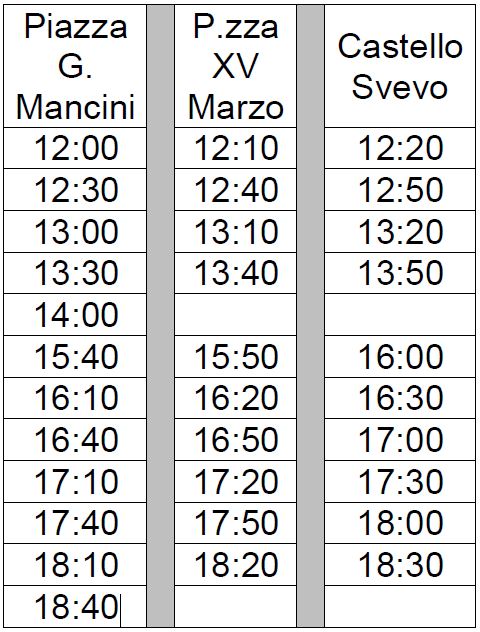 “Si dà avviso all’utenza che A.M.A.CO. S.p.A. per collegare il centro Città con il centro storico e il Castello Svevo da mercoledì 17 gennaio 2018 la linea “Navetta Castello” effettuerà il seguente percorso: