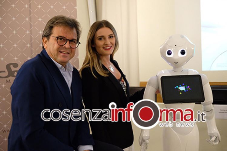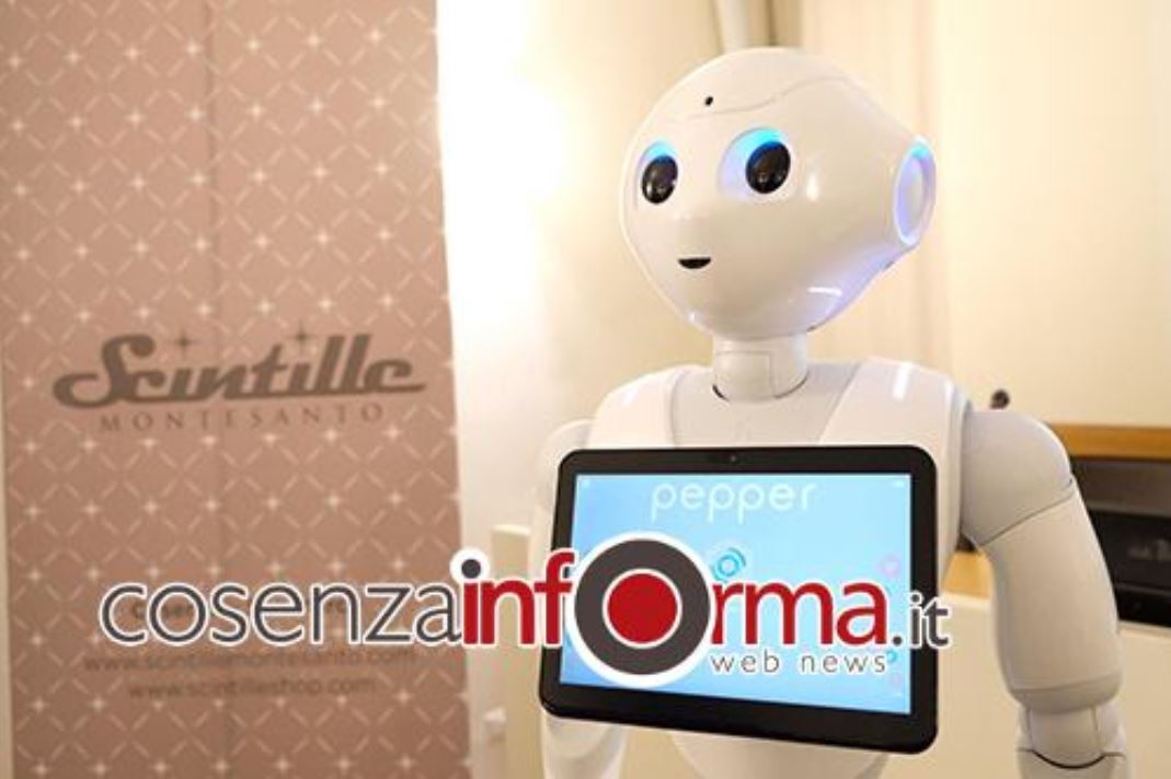 “Una stupefacente accoglienza … robotica. Prego, accomodatevi. Si chiama Pepper ed è un robot che sa parlare, cantare e ballare. Si muove e si sposta agevolmente e sa esprimersi in ogni lingua del mondo. E’ un robot umanoide, progettato in Giappone. Presentato a Villa Rendano, sarà impiegato nella gioielleria Scintille Montesanto”