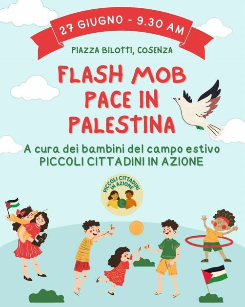 Giovedì 27 giugno, alle ore 9:30 in Piazza Bilotti a Cosenza, i bambini del campo estivo Piccoli Cittadini in Azione, insieme a loro coetanei della città di Cosenza, coinvolti grazie ad altri centri estivi e associazioni cittadine, daranno vita a un flash mob silenzioso per la Pace in Palestina