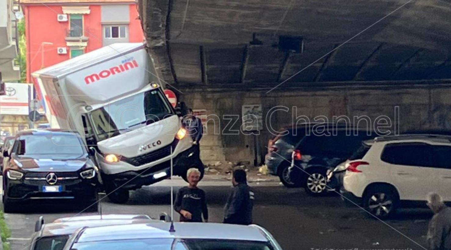 Cosenza, furgone incastrato tra un’auto e la soprelevata