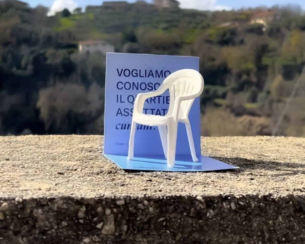 A dare forma e carattere a questa edizione della festa è un oggetto tanto umile quanto evocativo: la sedia monoblocco, quella sedia di plastica bianca che da decenni popola cortili, marciapiedi e piazzette di tutta Italia. Simbolo universale della provincia italiana, è onnipresente nei momenti di socialità spontanea: viene trascinata fuori al tramonto, sistemata all’ingresso di casa per osservare chi passa, disposta in cerchio durante le feste, oppure usata come segnaposto, punto d’ascolto o appoggio temporaneo.