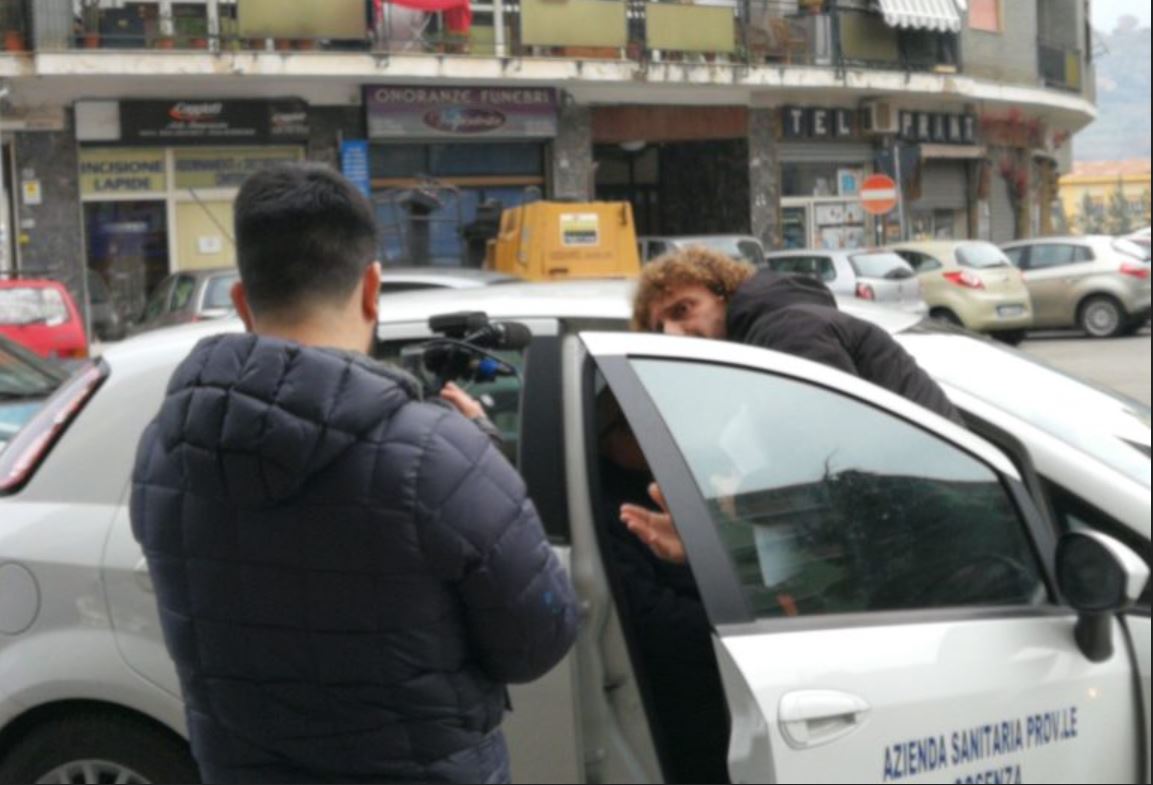 “COSENZA – Sono di pochi minuti fa le foto appena scattate che ritraggono la “Iena” Filippo Roma mentre cerca di intercettare una macchina dell’Asp, Azienda Provinciale di Cosenza.”