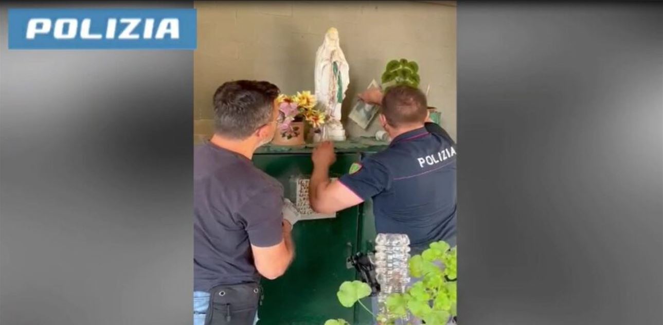 La droga era nascosta sotto la statua della “Regina Pacis”. C’erano alcune dosi di hascìsc, marijuana e cocaina sull’altare votivo allestito, in via Popilia, sotto il portico di un palazzo