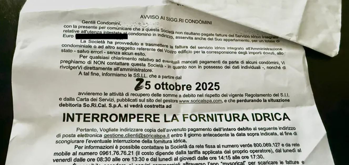 “I toni della lettera che Sorical sta inviando a tappeto a numerosissime utenze a Cosenza e provincia, hanno sollevato un polverone, non solo per il sollecito in sé, che reca notizia di un insoluto da verificare con attenzione perché si tratta di una quota condominiale e non individuale, ma per la scritta a caratteri cubitali in cui Sorical minaccia di “interrompere la fornitura idrica”.”