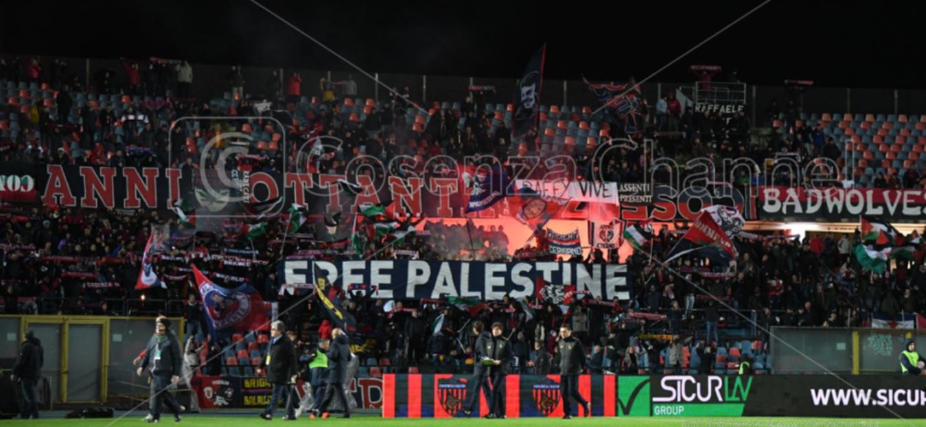 Lo striscione “Free Palestine” con cui la Curva Nord del Cosenza ha accolto l’ingresso in campo dei Lupi nel match di venerdì sera contro il Modena è diventato un caso