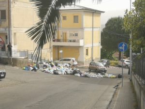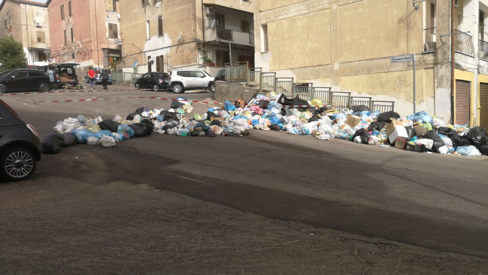 Buste di spazzatura da una parte all’altra del marciapiede ed il nastro a bloccare il passaggio