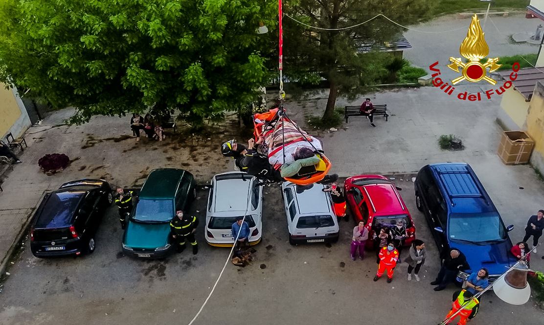 “I vigili del fuoco sono intervenuti a Cosenza in via Raffaele Cardamone per offrire assistenza. L’intervento è stato richiesto in quanto un paziente necessitava di ricovero presso struttura ospedaliera e lo stesso non poteva essere trasportato con semplice barella attraverso il vano scala dello stabile.”
