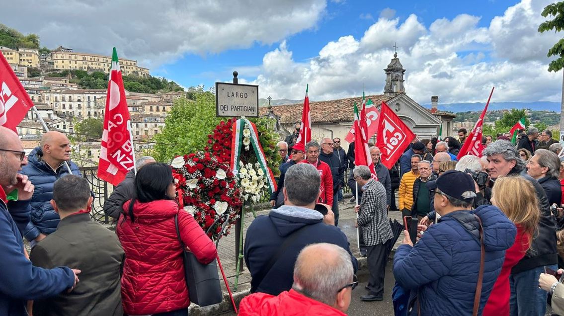 “Deposta da parte della Cgil e da una lunga schiera di associazioni antifasciste una corona di fiori a Largo dei Partigiani, lo spiazzo che dalla Galleria Nazionale domina il centro storico di Cosenza. La ricorrenza del 25 aprile ha spinto anche questโanno attivisti, sindacalisti, comitati cittadini, rappresentanti dellโAnpi ed esponenti dei partiti di centrosinistra a celebrare la Festa della Liberazione in piazza.”