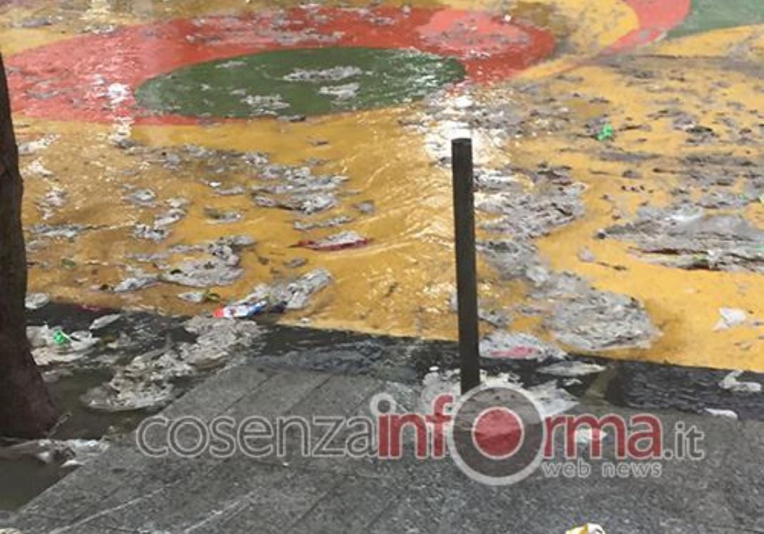 “Liquami su piazza Rodotà ai piedi della gradinata della scuola Lidia Plastina Pizzuti. Carta igienica e liquami che uscivano dai tombini e che in pochi minuti hanno allagato gran parte della piazza. Insieme ai liquami una serie di altri rifiuti.”