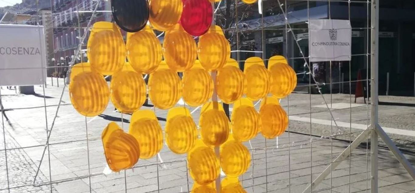“Allestito sull’isola pedonale di corso Mazzini, l’albero di Natale della memoria è stato ideato dall’artista Francesco Sbolzani con i caschi colorati da lavoro per la Fondazione “Sosteniamoli subito” dell’Anmil, associazione nazionale dei mutilati e invalidi del lavoro.”