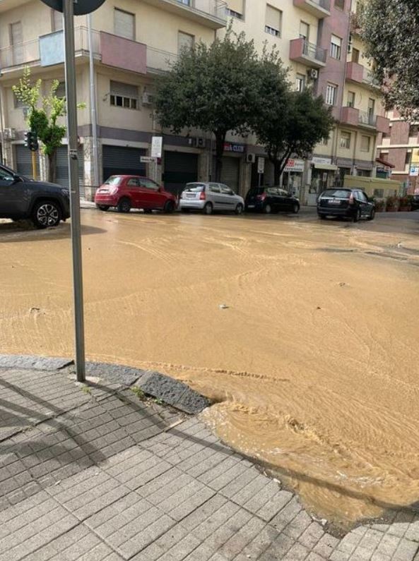 “L’improvvisa rottura di una condotta idrica, verificatasi nel tardo pomeriggio di ieri nella parte alta di via Cattaneo, ha determinato la fuoriuscita di notevoli quantitativi d’acqua per tutta la stessa via Cattaneo e fino all’incrocio con via Roma e via Frugiuele.”