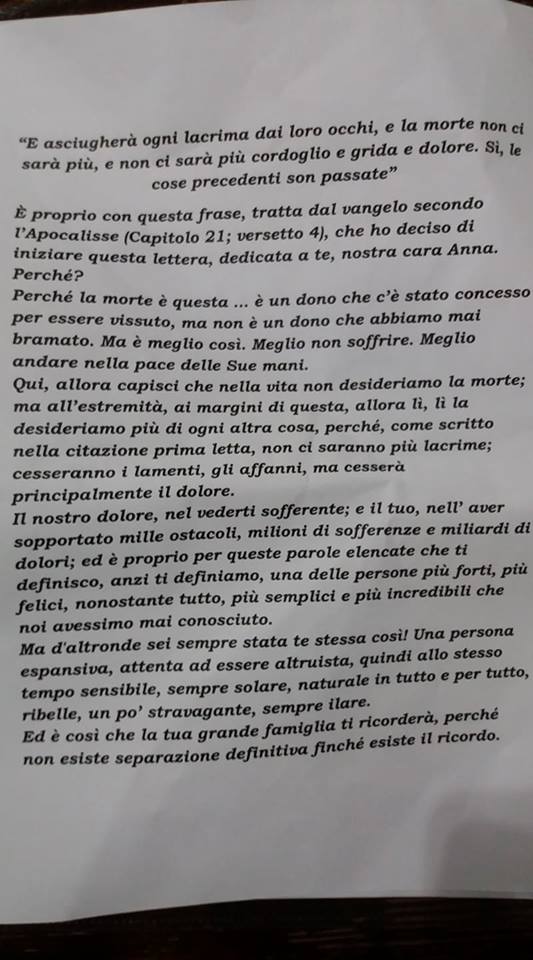 Queste sono le parole scritte e lette in chiesa da Dario, cuginetto 14enne di Anna: