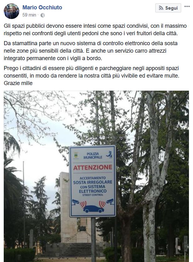 Il sindaco di Cosenza, Mario Occhiuto, ne da diffusione questa mattina tramite un suo post su Facebook: