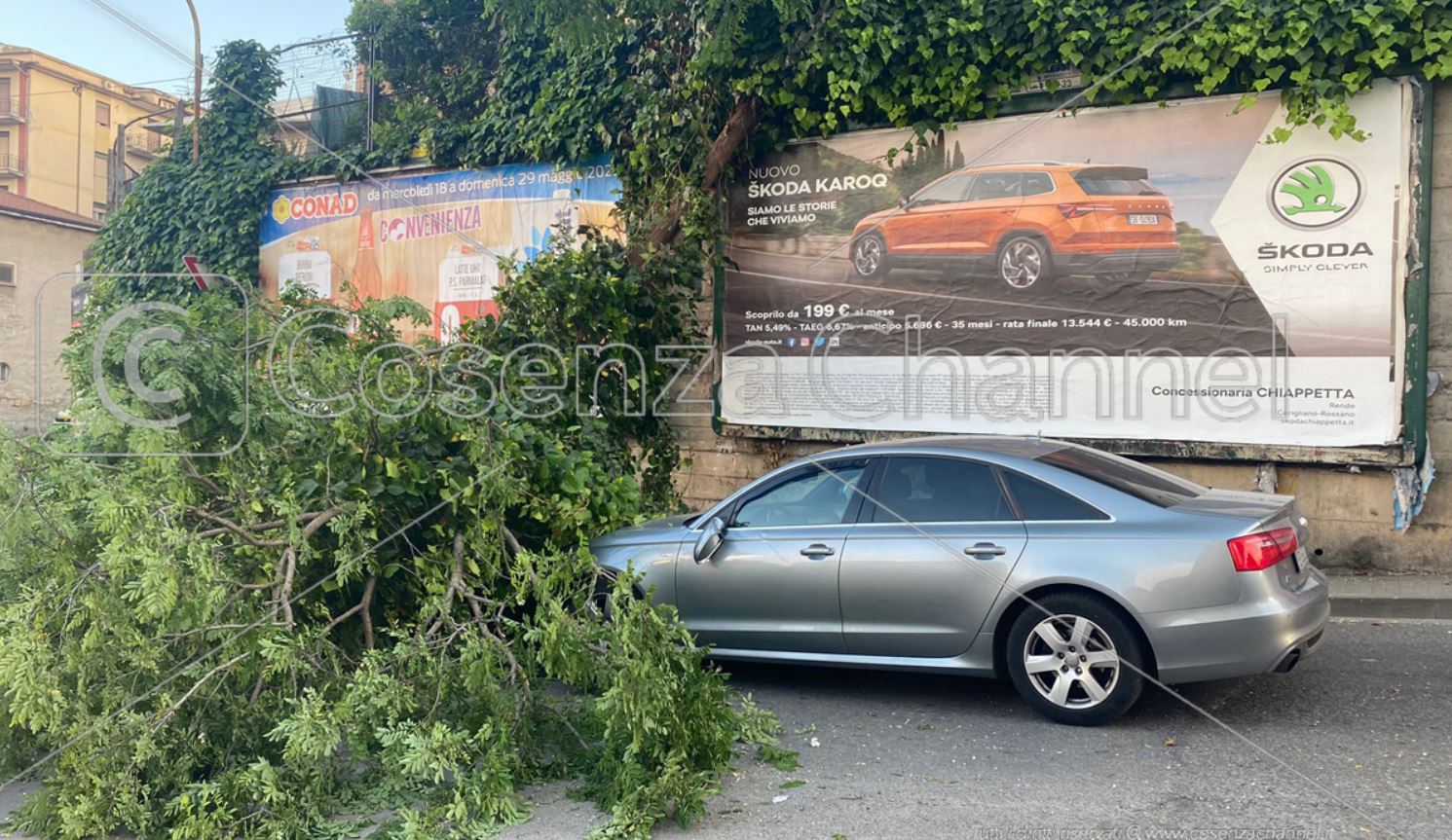“Tragedia sfiorata in via Pasquale Rebecchi a Cosenza. Un albero è caduto durante il transito di un’auto di grossa cilindrata distruggendo la parte anteriore del veicolo. L’uomo, per fortuna, non ha subito conseguenze fisiche, ma tanta è stata la paura”