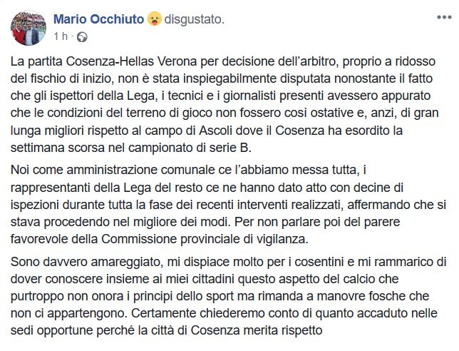 “La partita Cosenza-Hellas Verona per decisione dell’arbitro, proprio a ridosso del fischio di inizio, non è stata inspiegabilmente disputata nonostante il fatto che gli ispettori della Lega, i tecnici e i giornalisti presenti avessero appurato che le condizioni del terreno di gioco non fossero così ostative e, anzi, di gran lunga migliori rispetto al campo di Ascoli dove il Cosenza ha esordito la settimana scorsa nel campionato di serie B.