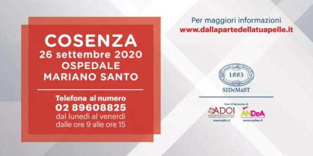 Le visite gratuite si terranno sabato 26 settembre presso UOC di Dermatologica ubicata al Mariano Santo di Cosenza diretta dal Dott. Eugenio Provenzano