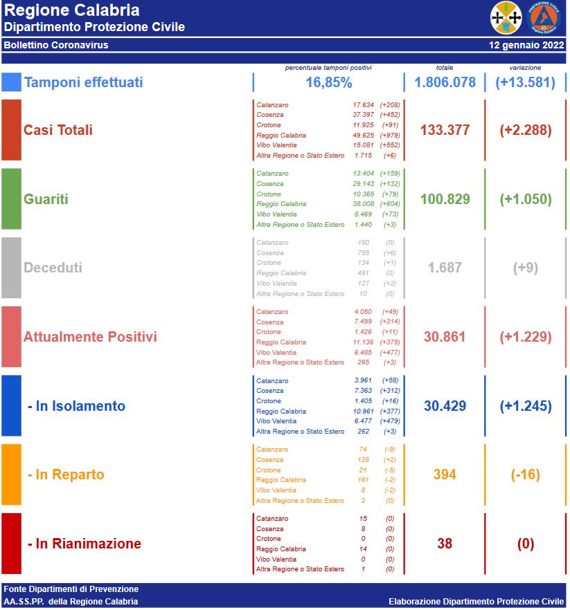 A livello calabrese, si contano 2.288 nuovi contagi a fronte di 13.581 tamponi effettuati.