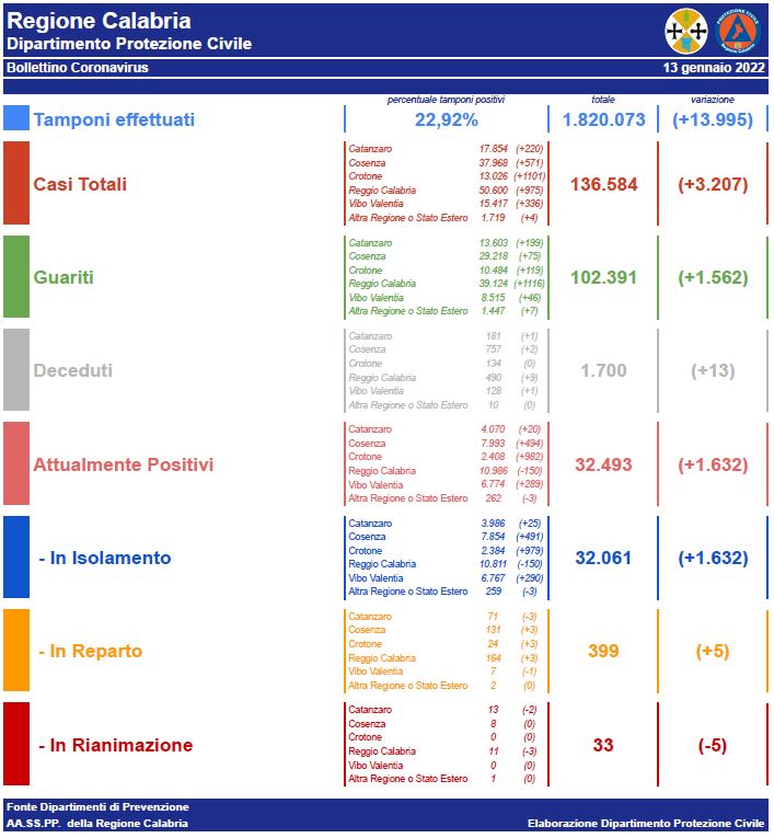 A livello Calabria, si contano 3.207 nuovi contagi a fronte di 13.995 tamponi effettuati.