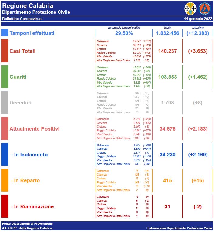 A livello Calabria, si contano 3.653 nuovi contagi a fronte di 12.383 tamponi effettuati.
