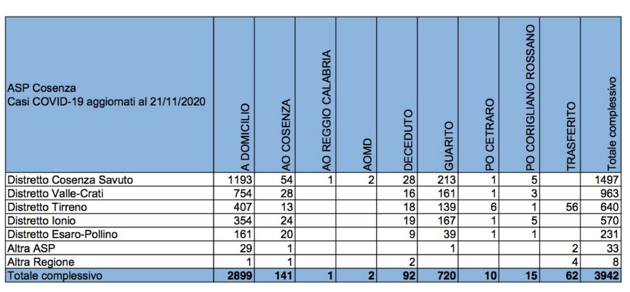 “LAsp di Cosenza nella serata di ieri ha comunicato che si sono registrati 195 nuovi casi, così distribuiti: 2 nuovi ricoveri, 11 in Pronto Soccorso, ed 1 trasferimento da altri reparti in rianimazione, 182 nuovi pazienti a domicilio. Si registrano 3 decessi di pazienti in Rianimazione e nessun guarito.”