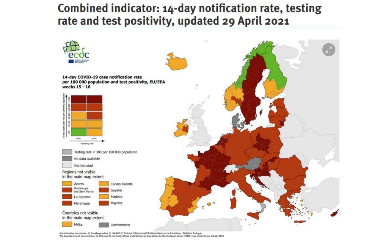 La Calabria risulta in grigio scuro, colore assegnato in caso di mancanza di dati disponibili o per un numero insufficiente di test. Equivale nella legenda dell’Ecdc a un’area per la quale “le informazioni sono insufficienti o il tasso di test รจ inferiore a 300 casi su 100.000”“