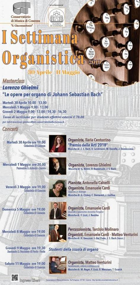Dal 30 aprile al 1 maggio, Lorenzo Ghielmi, uno dei massimi conoscitori dell’opera organistica di Johann Sebastian Bach, terrà una masterclass rivolta sia agli studenti del conservatorio che ad organisti esterni, , utilizzando l’organo della Cattedrale di Cosenza e l’organo Zeni del Conservatorio. Lo stesso Ghielmi si esibirà in un concerto presso la Chiesa di S. Antonio a Rende la sera del 1 maggio alle ore 20 con un programma dedicato alla musica organistica nord europea del XVII e XVIII secolo.