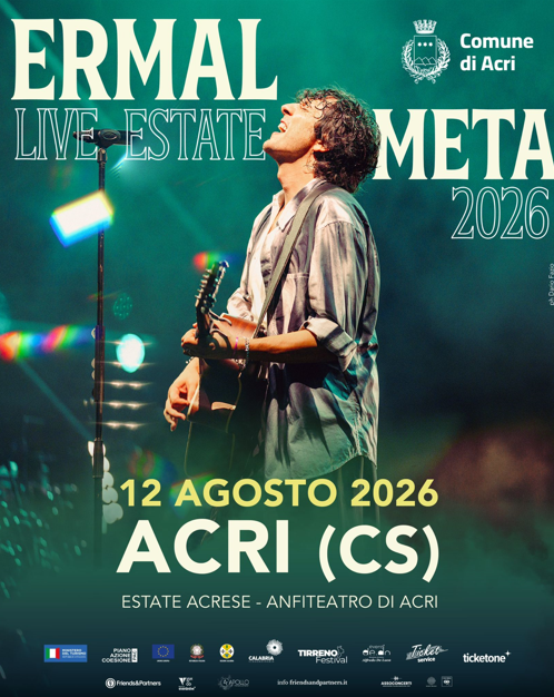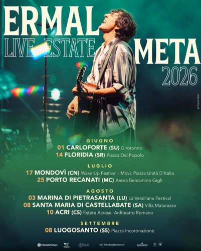 Dopo aver annunciato il suo atteso ritorno sui palchi indoor con il “Live Club 2026”, Ermal Meta svela le nuove date del tour estivo 2026: sarà in Calabria il 10 agosto ad Acri (Cs)