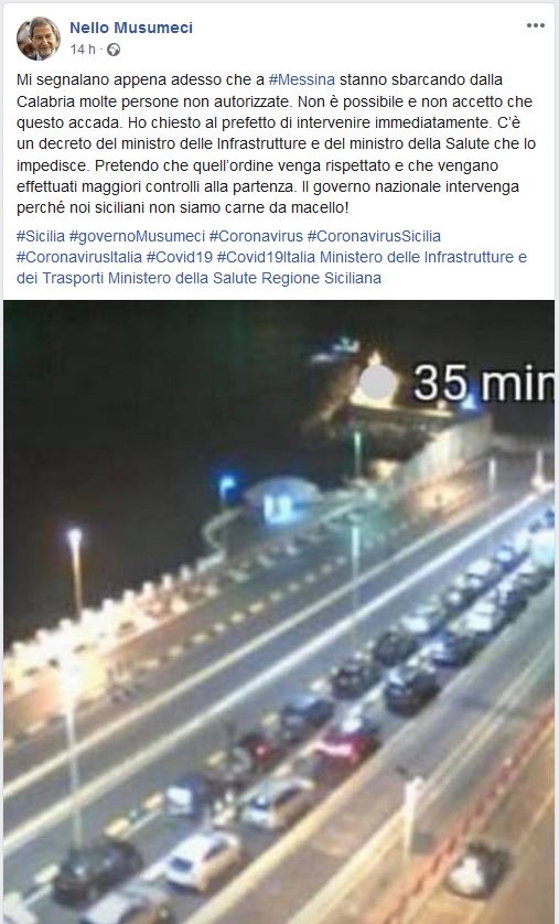 “In tempi di coronavirus, quando l’imperativo assoluto è “Restate a casa”, le code chilometriche agli imbarchi di Villa San Giovanni verso la Sicilia fanno capire quanto poco alcune persone sembrano aver recepito le normative in vigore per contrastare il contagio.”