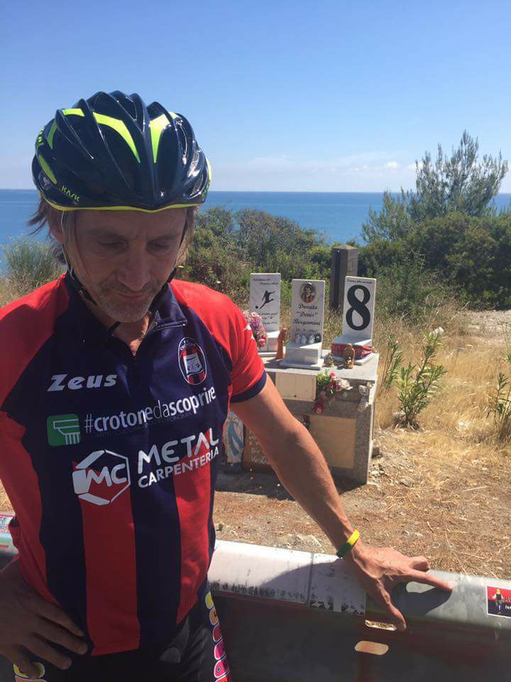 Momento di grande commozione alla partenza della seconda tappa del viaggio in bici dell’ allenatore del Crotone Davide Nicola che lo porterà fino a Torino.
