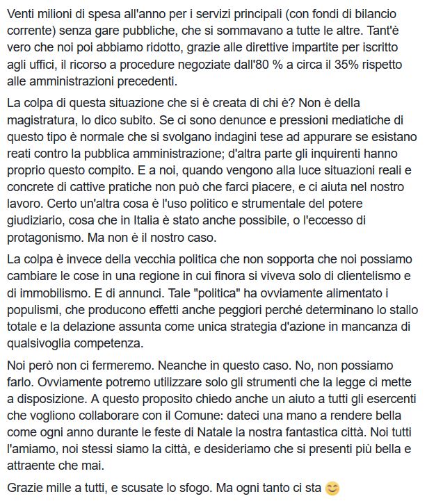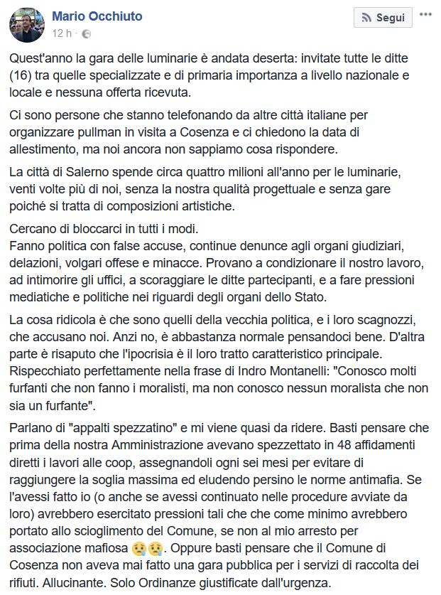 “Cosenza rischia di rimanere orfana delle luminarie e di trascorrere il suo Natale più grigio, da quando Mario Occhiuto ha varcato la soglia di Palazzo dei Bruzi. E’ proprio il sindaco architetto a lanciare l’allarme, affidando il proprio sfogo ad un post sui social.
