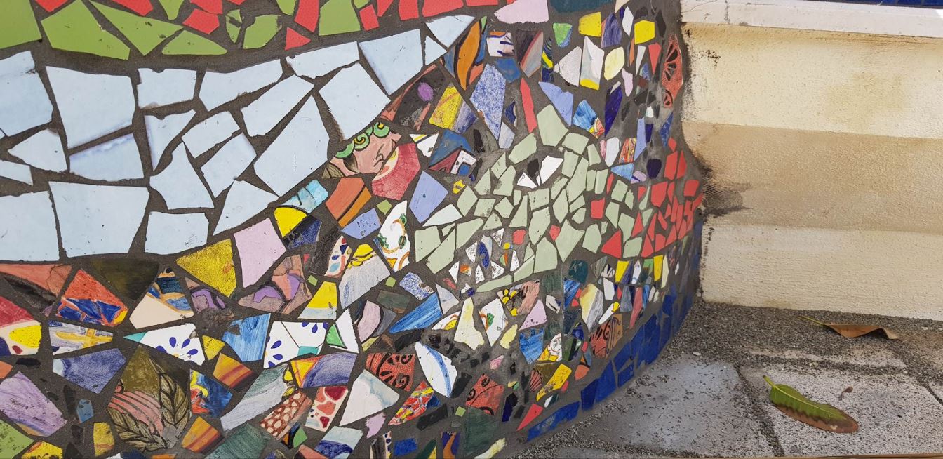 “Patrocinato dal comune di Cetraro, con la collaborazione del Dirigente Scolastico Prof. Graziano Di Pasqua, e dal Progetto ideato dal Prof. Fulvio Longo, i ragazzi del IV artistico (età 17 anni) stanno realizzando questi mosaici con la tecnica del ‘Trencadis’, usata da Gaudí come arredo urbano a Barcellona.