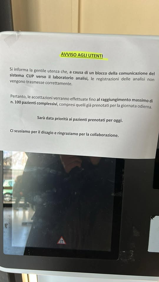E’ da inizio settimana che va avanti questa storia … In sala prelievi stanno registrando a mano gli esami paziente per paziente, mentre in sala sportelli c’è una responsabile che chiama in base ai famosi numerini dati sui pezzetti di carta … Siamo al terzo mondo.”