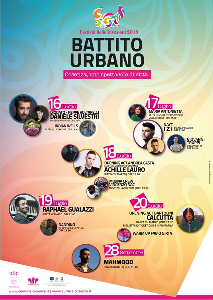16 luglio Daniele Silvestri, fresco di uscita col suo nuovo “La terra sotto i piedi”, Targa Tenco 2019 per la Miglior Canzone con Argentovivo, sarà a Cosenza in una delle poche e blasonate uscite estive, che anticiperanno il tour nei palasport a partire dall’autunno; prima di lui sul palco PEPPE VOLTARELLI (cantautore calabrese doc) e DIODATO (direttore artistico del 1 maggio di Taranto) ad aprire il festival e questa prima serata che si preannuncia lunga e dedicata alla canzone d’autore che si chiuderà in Villa vecchia con il Live set di INDIAN WELLS.