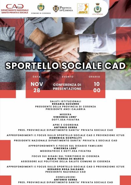 La Conferenza stampa sarà presieduta dalla Presidente della Provincia Rosaria Succurro, l’Assessore alle politiche della Salute del Comune di Cosenza Maria Teresa De Marco, l’Ing. Gerardo Rosa Salsano Presidente Nazionale e Internazionale CAD, il Presidente del Dipartimento Nazionale CAD Sanità Privata e Sociale Domenica Scopelliti, il Presidente Provinciale CAD Cosenza Dipartimento Sanità Privata e Sociale Antonio Serra, Dott.ssa Fisiatra e moderatrice della presentazione CAD Vincenza Lorè e Alfonso Vuono Responsabile legale Gruppo Mazzini. La presentazione dello Sportello Sociale CAD ha ottenuto il Patrocinio della Provincia di Cosenza, del Comune di Cosenza (Cs) e del comune di Rende (Cs)