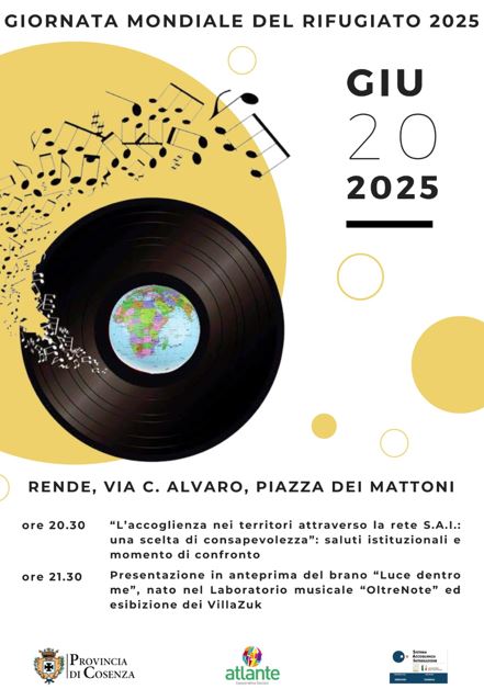 In occasione della Giornata Mondiale del Rifugiato, il 20 giugno 2025, la Cooperativa Sociale Atlante, ente gestore del progetto S.A.I. della Provincia di Cosenza, organizza un evento presso la Piazza dei Mattoni a Rende