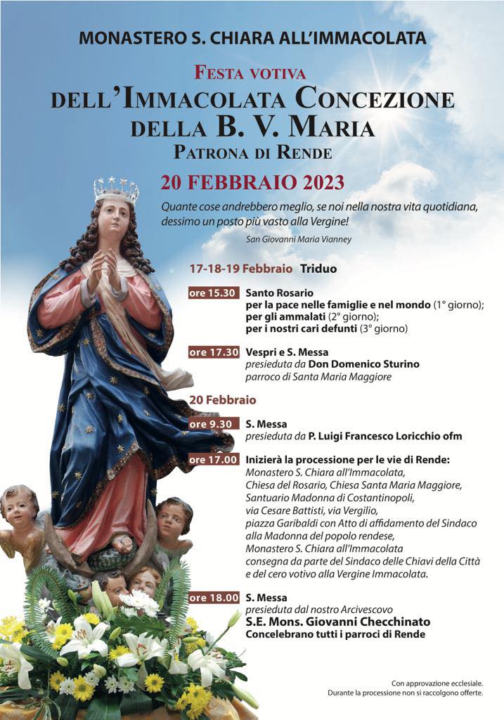 Sarà celebrata domani, 20 febbraio, 2023 la festa dell’Immacolata Concezione, patrona di Rende