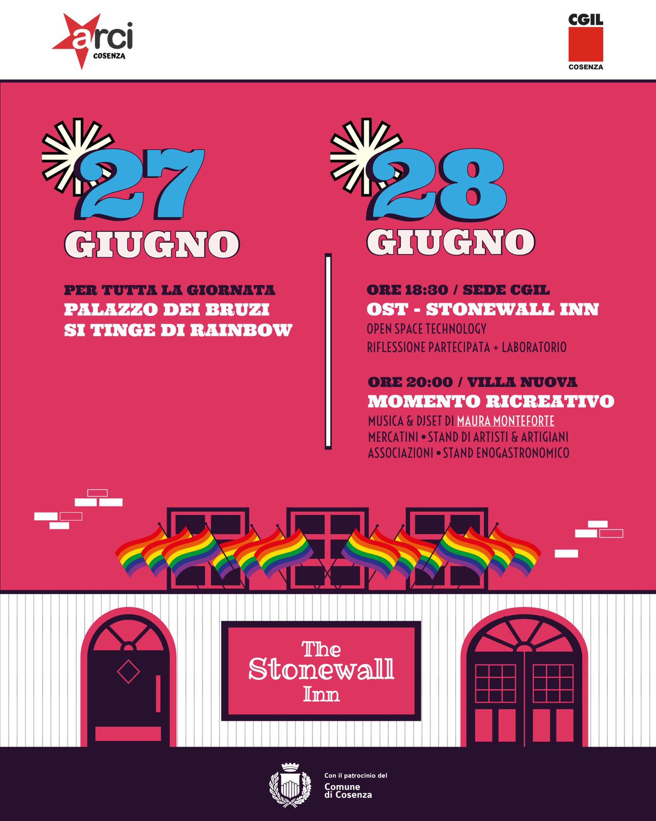 “I diritti LGBTQI+ – afferma il sindaco di Cosenza, Franz Caruso – devono essere non solo riconosciuti e, quindi, rispettati, ma anche difesi senza se e senza ma. E Cosenza, città aperta e plurale, si batterà sempre contro ogni forma di discriminazione e pregiudizio. Anche per questa ragione, l’Amministrazione Comunale ha dato il patrocinio e parteciperà fattivamente alla manifestazione The Stonewall Inn, promossa dall’Arci Cosenza e dalla Cgil Cosenza e che si svolgerà Lunedì 27 e Martedì 28 giugno, nel mese del Pride. In particolare, lunedì 27 giugno Palazzo dei Bruzi si tingerà di Rainbow per tutta la giornata.