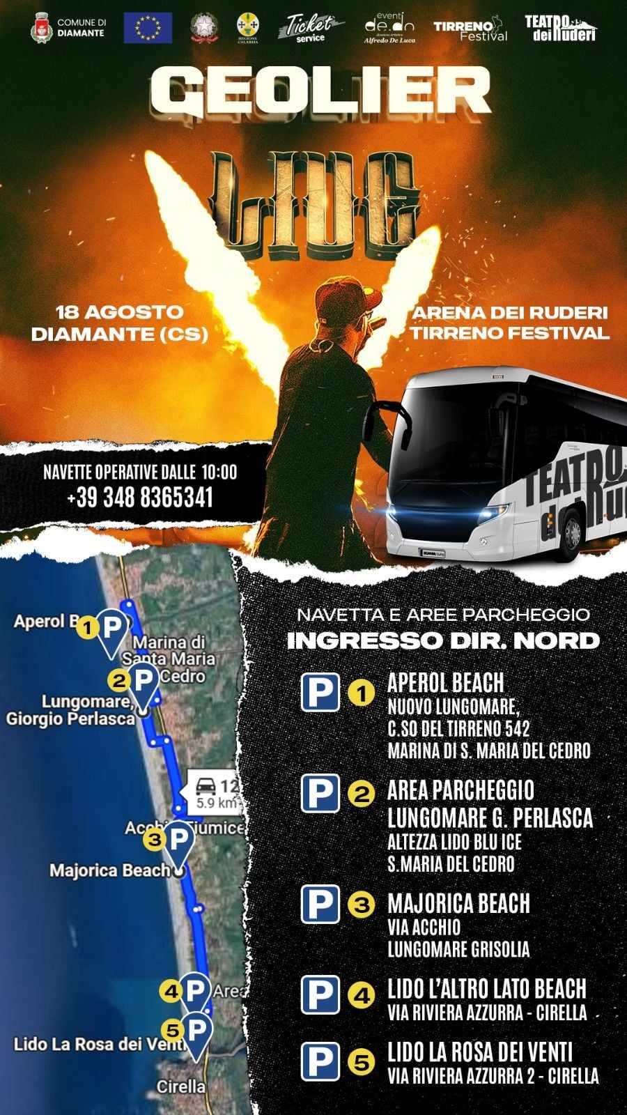 Da Direzione Nord aree parcheggio da Santa Maria del Cedro sul nuovo lungomare (altezza Aperol Beach) e Lungomare Perlasca (Lido Blu Ice), mentre a Grisolia parcheggi presso la zona di Via Acchio (Majorica Beach). Divieto di introdurre bottiglie di vetro all’interno dell’arena e materiale facilmente infiammabile.