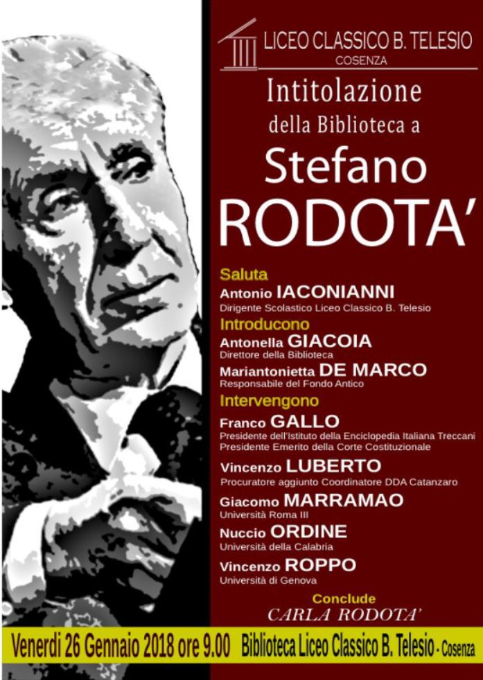 Grandi nomi della cultura italiana domani al Liceo Classico ‘Telesio’ di Cosenza per l’intitolazione della Biblioteca della scuola a Stefano Rodotà. Grande evento di cultura e di formazione. Interverranno oltre a Carla Rodotà, moglie dell’insigne giurista, anche Franco Gallo, presidente dell’Istituto della Enciclopedia Italiana Treccani e presidente emerito della Corte Costituzionale, Vincenzo Luberto, procuratore aggiunto coordinatore DDA Catanzaro, Giacomo Marramao, Università di Roma III, Nuccio Ordine, Università della Calabria, Vincenzo Roppo, Università di Genova, Antonella Giacoia, direttore della Biblioteca e Mariantonietta De Marco, responsabile del Fondo Antico.